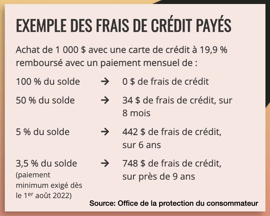 Pour m’aider à faire ce genre de calcul, l’Office de la protection du consommateur propose un outil qui permet de calculer les paiements minimums sur les cartes de crédit, la durée du remboursement et un comparatif des résultats en fonction de différents taux. C’est très utile pour mon budget et pour méditer à mon avenir financier…