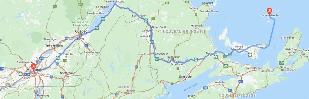 Pour mon road trip cette année, afin d’être vraiment dépaysé, j’ai décidé d’aller vers l’est, au coeur du golfe Saint-Laurent, saluer nos amis madelinots. L’archipel des Îles-de-la-Madeleine se trouve à 1400 km de Montréal, pour un trajet d’une durée de 19 h environ. Voici un itinéraire simple, court et sans détours comme sur la carte.