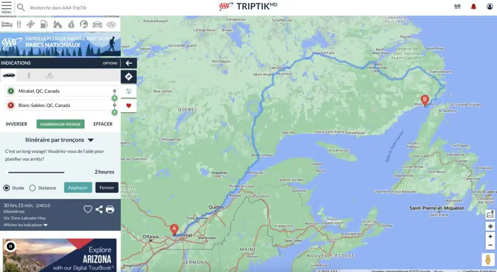 Pour continuer mes recherches, j’ai décidé de rester dans la belle province et d’aller au bout de la carte, de la route (et des capacités de Trip Tik), une virée que j’espère faire un jour : destination Blanc-Sablon, la municipalité la plus à l’est du Québec située à la frontière de la province de Terre-Neuve-et-Labrador. Le bout du monde en quelque sorte. L’application fonctionne super bien, même dans ce cas un peu extrême. Une fonction remarquable permet de choisir un chemin différent pour le retour. Moi qui déteste revenir sur mes pas, j’ai été conquis.