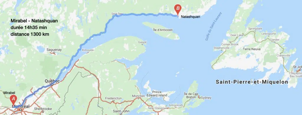 Par exemple, un voyage de Mirabel au village de Natashquan, c’est environ 1300 km de route. Si ton véhicule consomme 8 litres par 100 km (chargé), à 2$ le litre, ça te coûtera environ 400$ aller-retour. Le voyage de Mirabel à Banff dans les Rocheuses, c’est 3606 km, soit presque 3 fois la distance, donc plus de 1200$. Ça fait pas mal de bons soupers au resto !